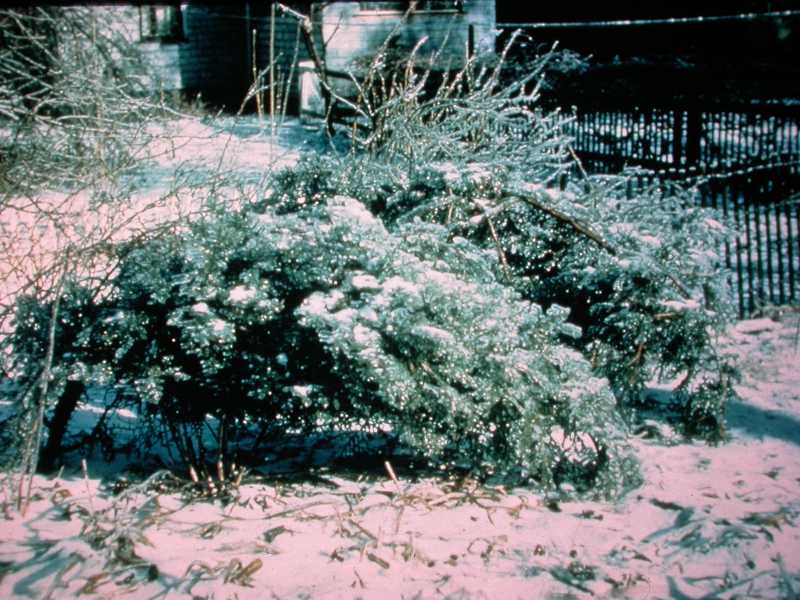 Heavy snowfall caused a row of arborvitae (Thuja occidentalis 'Klmeighteen' PATRIOT) to double over, nearly touching the ground