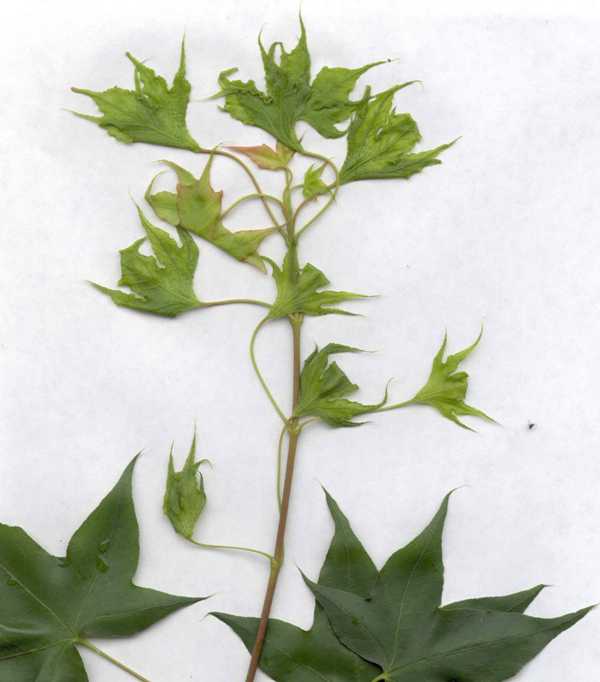 2,4-D herbicide damage to foliage of ginkgo (Ginkgo)