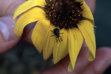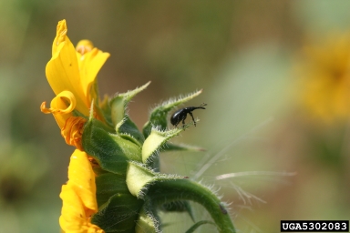 Adult head clipper weevil on sunflower petals. Whitney Cranshaw, Colorado State University, Bugwood.org