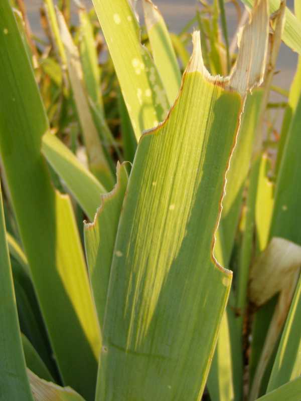Grasshopper (Orthoptera) damage on iris (Iris)