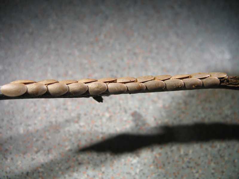 Katydids are members of the grasshopper family and can be distinguished by their long "horns," bright green color, and the male's loud, shrill call which sounds like "Katy did" and thus has earned them their onomatopoeic name. They do not pose any particular problem for the home gardener but do lightly feed on shrub and tree foliage.