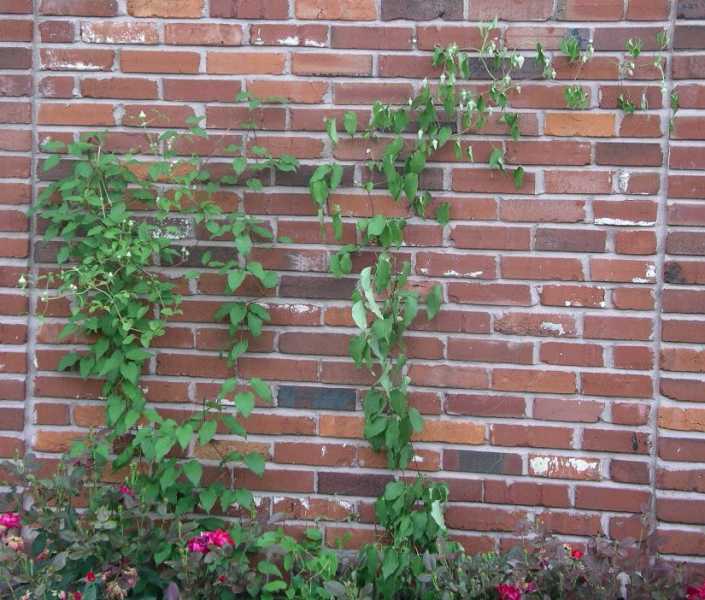 Clematis vine that looked limp and drought-stressed a week earlier is now beginning to brown and die due to clematis wilt disease. Note, the healthy vine next to it.