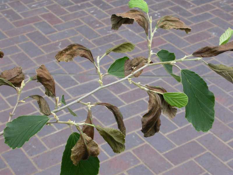 Entire branch tip of witch hazel (Hamamelis) blighted, possibly by Phyllosticta hamamelis, leaf blotch of witch hazel