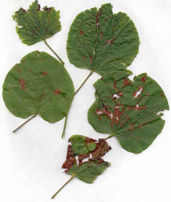 A closer look at the frozen leaves on a ginkgo (Ginkgo) that lost all of its leaves during a late spring freeze; the tree will later put new leaves