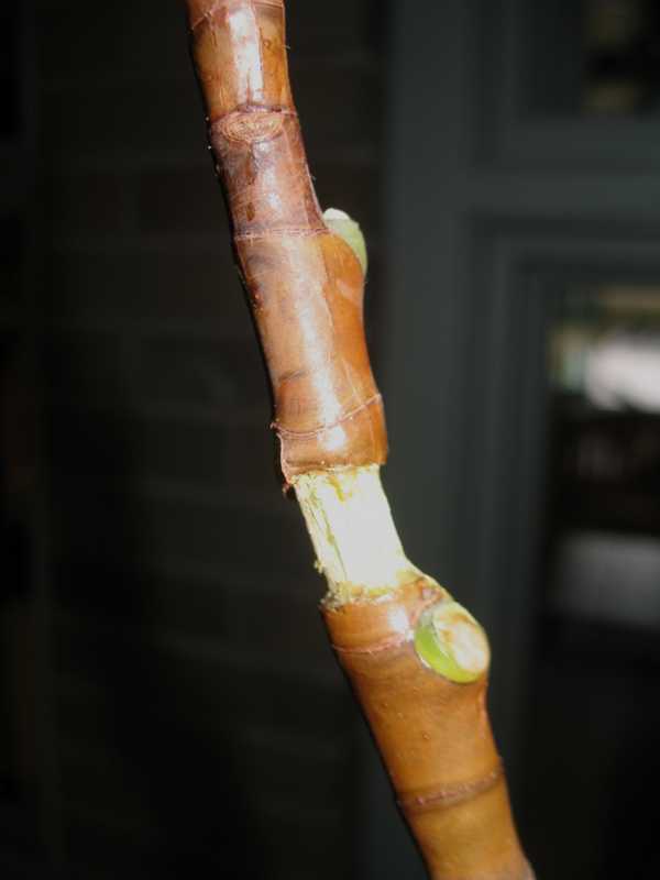 Carefully remove the bark by cutting up and down making sure not to cut into the wood of the stem. On some plants a ring of bark may come off easily. On other plants it may take some careful cutting.