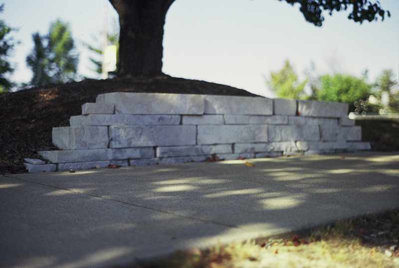 Description: Cut stone is used to construct a retaining wall for a tree at a concrete sidewalk.