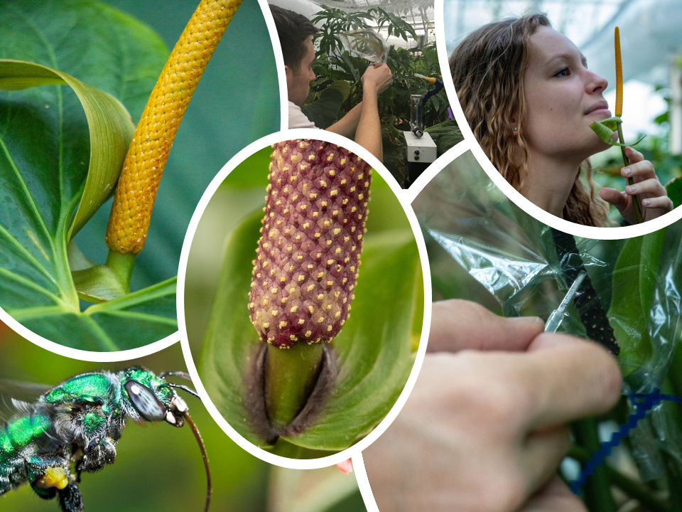Project #2: Are olfactory cues alone sufficient for pollinator attraction in Anthurium? Bee-pollinated Anthurium species share a pleasant floral scent, thought to be important in attracting and influencing pollinator behaviors. These species also tend to share other floral traits, such as diurnal anthesis and bright yellow or cream flower color. Bees have excellent color vision and can discriminate between various flower colors and patterns, suggesting that visual attraction cues could also play a role in pollinator attraction.